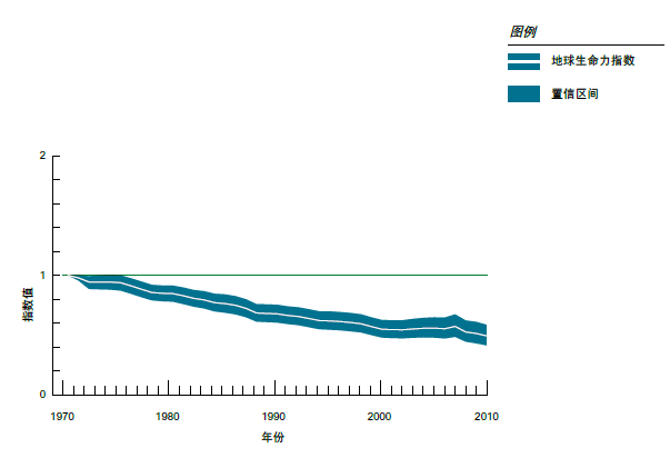 地球生命力指數(shù):全球地球生命力指數(shù)在1970年至2010年間下降了52%。這表明,總的說來,脊椎動物物種種群規(guī)模平均約為40年前的一半。這一數(shù)據(jù)基于3,038種哺乳動物、鳥類、爬行類、兩棲類和魚類物種10,380個種群的生存變化趨勢。白線表示指數(shù)值,陰影區(qū)域代表變化趨勢95%的置信區(qū)間(世界自然基金會、倫敦動物學學會,2014)