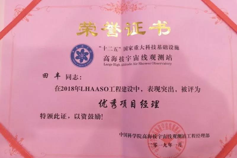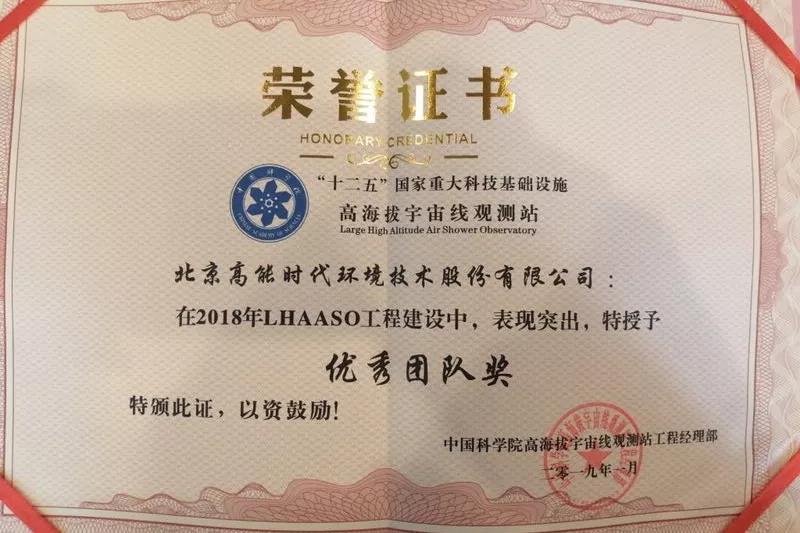 2019年1月20日,在中國科學院2018年“十二五”國家重大科技基礎設施項目高海拔宇宙線觀測站(LHAASO)工程建設總結會上,高能環(huán)境參建的“水契倫科夫探測器水池”(WCDA)特種防滲項目得到業(yè)主的高度認可,并被授予“優(yōu)秀團隊獎”,高能環(huán)境項目經理田豐被評為“優(yōu)秀項目經理”。